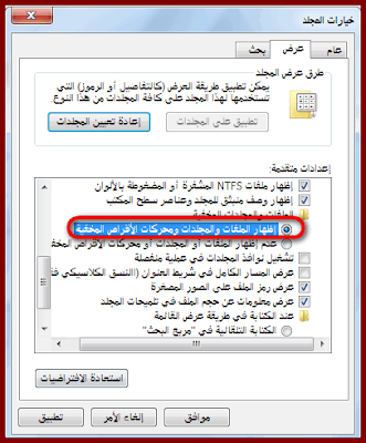 9 - نزيل علامة الصواب من أمام مخفي ليظهر الملف حتى بعد ارجاع الإعدادات في خيارات المجلد كما كانت: