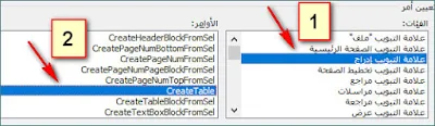 5 - نختار الفئة التي نريد ثم الأمر ( مثلا رسم جدول - ادراج صورة...) اختصاره